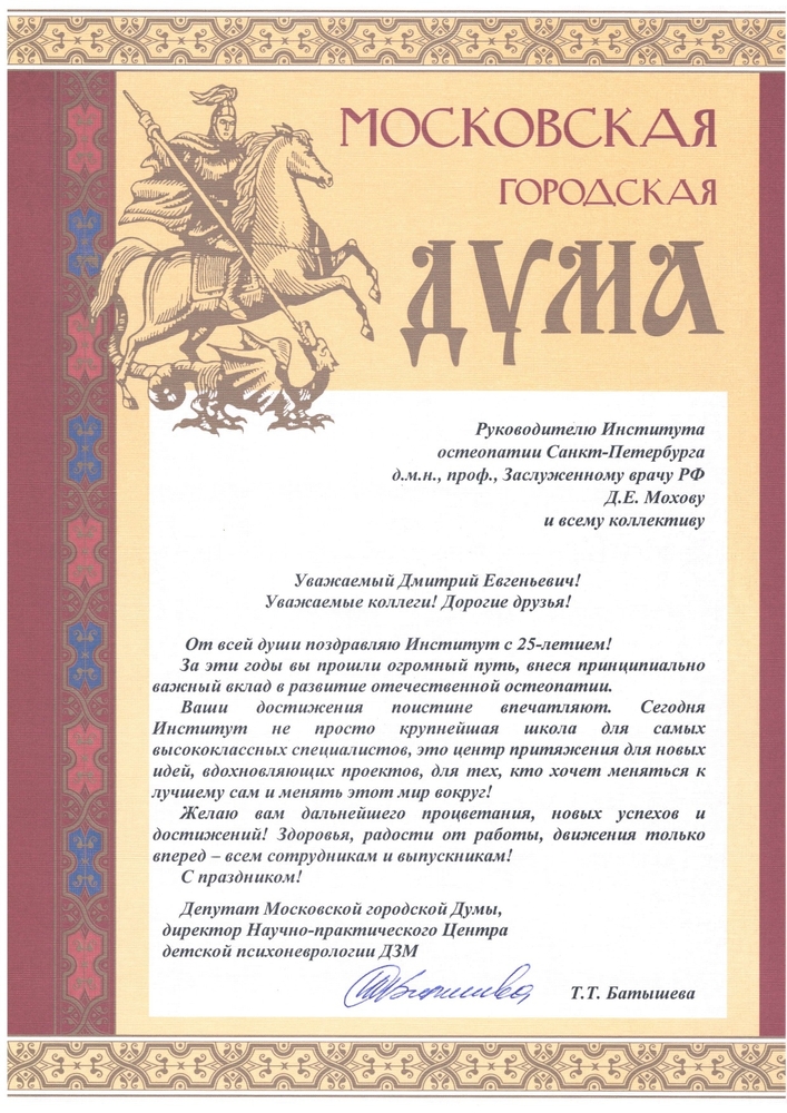 С 25-летием нас поздравляет Татьяна Тимофеевна Батышева — депутат Московской городской Думы, доктор медицинских наук, профессор, Заслуженный врач Российской Федерации, директор ГБУЗ «Научно- практический центр детской психоневрологии Департамента здравоохранения г. Москвы».